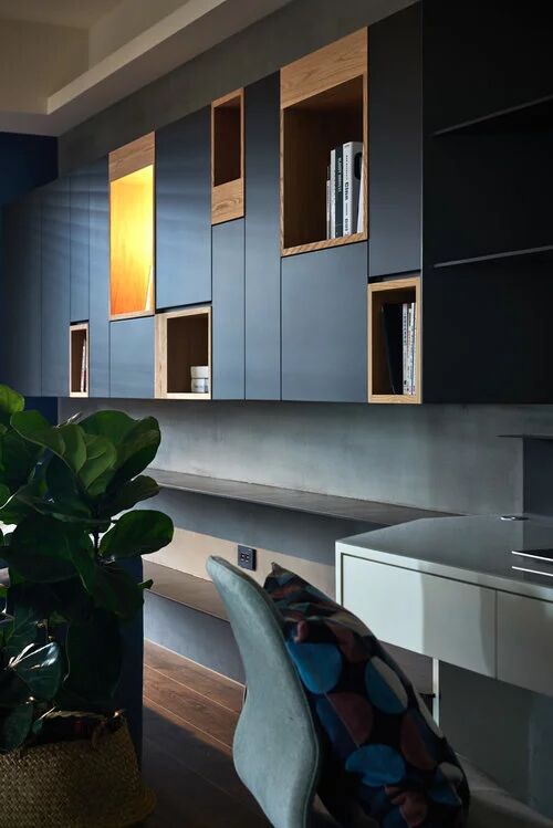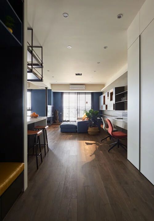 隔板下方還衍生出了一個新的辦公空間,并采用雙座設(shè)計,完美地賦予客廳更多的機能,使其多了一個可以同時容納兩個人在此工作、學(xué)習(xí)的小型書房。
