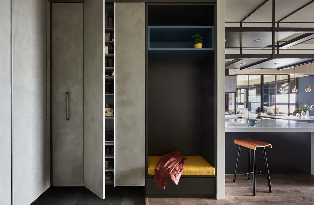 設(shè)計師特意丟掉繁瑣花哨的裝飾,而是采用敞開式+封閉式的多功能設(shè)計,巧妙地解決了主人進出門時懸掛衣物、擺放鞋子以及坐著換鞋的需求。